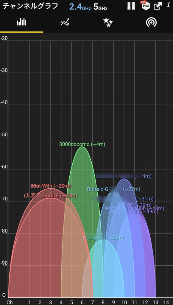 Androidのアプリで計測したとある埼玉県のドトールで飛んでいるWi-Fiはこんな感じです。