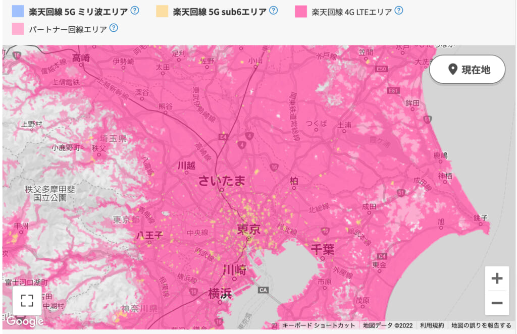 2022年4月現在、楽天モバイルの5G対応エリアは、かなり狭いと言えます。