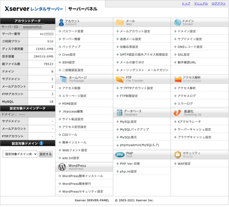 コントロールパネルが項目ごとに分かれており、操作が非常にしやすいです。一般的にサーバと連想されるコマンド(SSH)もしなくて済むようになっているので、レンタルサーバ初心者の方も非常に使いやすいコントロールパネルではないでしょうか。