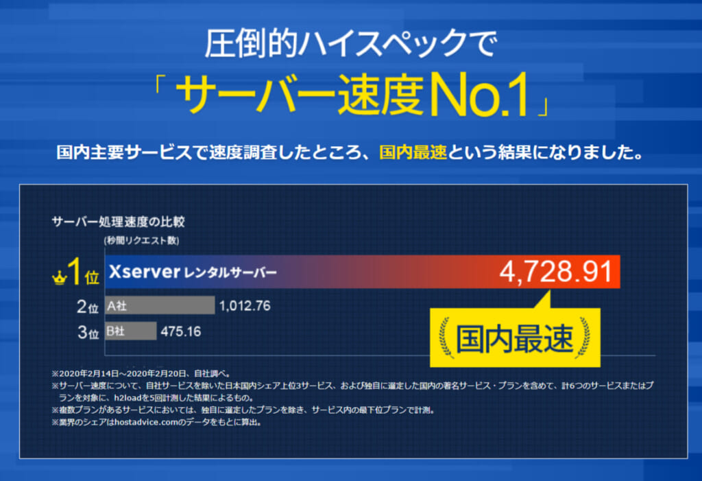 エックスサーバーは、ユーザーが使うサーバのスペックを高性能(具体的にはCPUとメモリをかなり良いモノを搭載)にすることで、圧倒的な処理速度を実現しています。