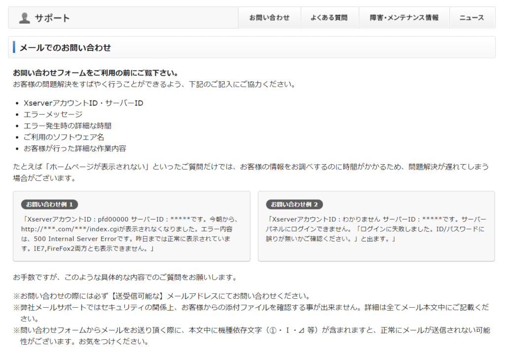 エックスサーバーでは、メールもしくは電話でのサポートの受付があります。