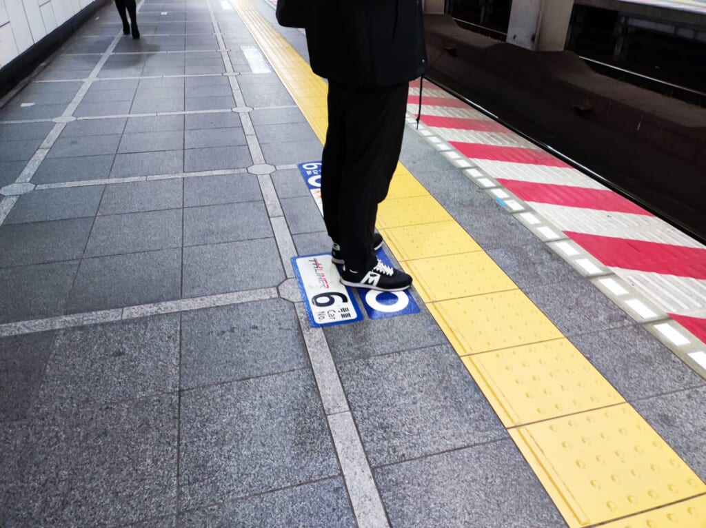 いろいろと探してみたりしましたが、結局わからなかったので、駅員さんに聞いたところ、足元に書いてあるとのことでした。