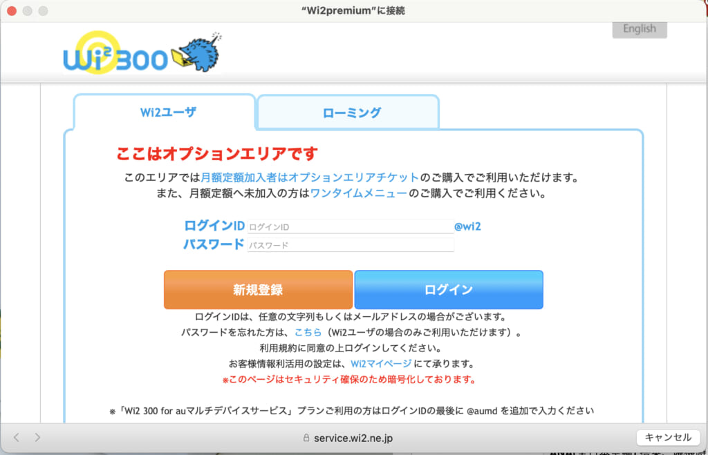 なお、SSID「Wi2Premium」に接続すると、上の画像のように表示されます。
